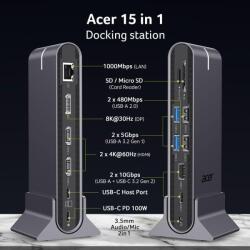 ACER 15in1 USB Type-C univerzális mini-dokkolóEAN: 4712842946779 HomeAz ACER dokkolóállomás tökéletes megoldás a mindennapi munkához és szórakozáshoz. Gyors töltés és nagy teljesítmény100 W-ig támogatja a Power Delivery-t. Szünetmentes áramellátást biztosít az eszközök számára. Kikötők sokfélesége5x USB-A1x USB-C2xUSB-A 2.02xUSB-A 3.2 Gen11xUSB-A 3.2 Gen21xUSB-C Gen2Akár 10 Gbps szupergyors adatátvitel támogatása. Memóriakártya-olvasók és egyéb kimenetekSD és microSD olvasókKettős HDMIDisplayPortGigabit EthernetKombinált 3,5 mm-es audiocsatlakozóMűszaki adatokGazdai interfész: USB-C Kompatibilitás: Windows, ChromeOS, macOS Tápellátás: USB-C akár 100 W USB: 1 x USB-C 10Gb/s, 1 x USB-A 10Gb/s, 2x USB-A 5Gb/s, 2x USB-A 480Mb/s Videó: 2x HDMI 4K@60Hz Max, 1x Display Port 8K@30Hz Max RJ45: 1x 1 Gb/s Hang: 1x 3,5 mm-es combo SD / microSD: 3.0 verzió Üzemi hőmérséklet: 0 ~ 40 °C Szín: Sötétszürke Méretek: 162.3(L)*60(W)*60(H) mm Súly: 300 g