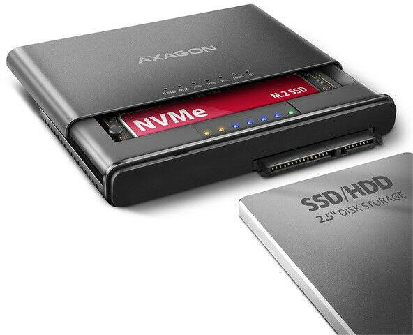 Axagon ADSA-CC: USB-C 10Gbps HDD/SSD Másoló és Dokkoló ?️ Az Axagon ADSA-CC egy sokoldalú eszköz, amely lehetővé teszi NVMe M. 2, SATA 2,5" és 3,5" HDD/SSD meghajtók egyszerű csatlakoztatását és másolását USB-C porton keresztül. Ideális adatmentéshez, rendszerfrissítéshez és meghajtók közötti másoláshoz. Főbb jellemzők: ? USB-C 3.2 Gen 2 interfész: Akár 10 Gbps adatátviteli sebesség a gyors másoláshoz és adatmentéshez. ? Kompatibilitás: Támogatja az NVMe M. 2, SATA 2,5" és 3,5" HDD/SSD meghajtókat. ? Másolási funkció: Egyszerűen másolhat adatokat meghajtók között, akár NVMe-ről SATA-ra is, számítógép nélkül. ?️ Szerszám nélküli kialakítás: Könnyű meghajtócsere a szerszám nélküli kialakításnak köszönhetően. ? LED visszajelzés: A LED-ek segítségével nyomon követhető a másolási folyamat állapota. Alumínium ház a jobb hőelvezetésért. UASP támogatás a gyorsabb adatátvitelért. TRIM támogatás az SSD meghajtók optimális teljesítményéért. A csomag tartalma: Axagon ADSA-CC eszköz USB-C - USB-C kábel USB-C - USB-A adapter Hálózati adapter Használati területek: Adatmentés és visszaállítás Rendszerfrissítés és klónozás Meghajtók közötti adatátvitel Külső tárolóeszközként való használat Az Axagon ADSA-CC egy praktikus és gyors megoldás a különböző típusú meghajtók kezelésére és másolására. Legyen szó adatmentésről, rendszerfrissítésről vagy egyszerűen csak a fájlok áthelyezéséről, ez az eszköz megkönnyíti a dolgodat. ?
