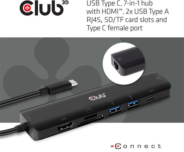 CSV-1592 - A Club 3D Hub egy USB Type C 7 az 1-ben hub HDMI 4K60Hz /SD-TF kártyanyílás / 2x USB Type A / USB Type C PD / RJ45, ideális megoldást biztosít az USB Type C vagy a Thunderbolt 3 port bővítésére, vagy egy speciális USB-porttal (PC/Laptop/tablet/M. ). Ez a hub a ma elérhető legújabb DP 1.4 Alt módú technológiát alkalmazza, amely lehetővé teszi a HDMI videó kimenetét maximum 4k/60 Hz-en, és közben USB 3.1 adatátvitelt maximum 5 Gbps sebességgel. A 2x USB Type A port lehetővé teszi 2 USB eszköz egyidejű csatlakoztatását.