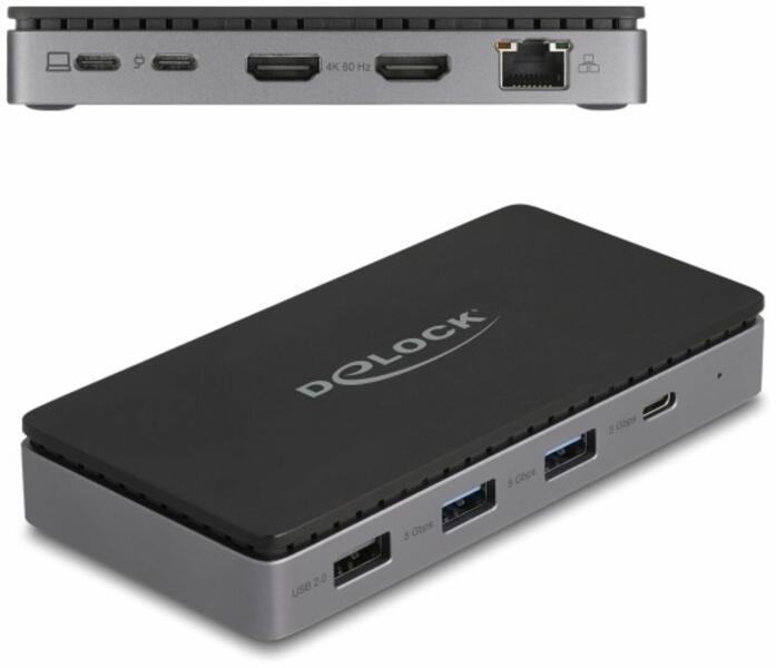 Delock USB-C Dokkolóállomás: Kettős 4K HDMI, USB, Gigabit LAN és 85W PD ? Ez a Delock dokkolóállomás ideális megoldás a laptop vagy számítógép csatlakoztathatóságának bővítésére. Egyetlen USB-C porton keresztül számos portot biztosít, beleértve a kettős HDMI kimenetet, USB portokat és Gigabit LAN-t. Emellett támogatja a Power Delivery-t (PD) is, így akár 85W-tal töltheti a laptopját használat közben. Tökéletes választás azok számára, akik egyetlen eszközzel szeretnék bővíteni a munkaállomásukat. Főbb jellemzők: ?️ Kettős 4K HDMI kimenet: Csatlakoztasson két monitort egyidejűleg, akár 3840 x 2160 @ 60 Hz felbontásban. ⚡ Multi-Stream Transport (MST): A DisplayPort kiterjesztett asztali konfigurációjának támogatása Windows alatt, lehetővé téve a képernyők egyéni irányítását vagy egyetlen nagy kijelzővé kapcsolását. ? Gigabit LAN: Élvezze a gyors és stabil hálózati kapcsolatot a beépített RJ45 porton keresztül. ? USB Power Delivery (PD 3.0): Töltse laptopját akár 85W-tal az USB-C PD porton keresztül. ⌨️ Számos USB port: 2 x USB 5 Gbps A-típusú, 1 x USB 5 Gbps USB Type-C, és 1 x USB 2.0 A-típusú port a perifériák csatlakoztatásához. Műszaki adatok:Csatlakozó LeírásUSB Type-C 1 x hüvelyHDMI-A 2 x hüvelyUSB 5 Gbps A-típus 2 x hüvelyUSB 5 Gbps Type-C 1 x hüvelyUSB 2.0 A-típus 1 x hüvelyGigabit LAN RJ45 1 x hüvely (10/100/1000 Mbps)USB Type-C PD 1 x hüvely (tápellátás)Rendszerkövetelmények: Android 13.0 vagy újabb Chrome OS Linux Kernel 5.15 vagy újabb Mac OS 13.1 vagy újabb Windows 10/10-64/11 iPad Air (4. generáció) vagy újabb iPad Pro (3. generáció) vagy újabb Surface Pro 7 Eszköz egy szabad USB Type-C porttal és DisplayPort alternate móddal vagy egy szabad Thunderbolt 3 vagy Thunderbolt 4 porttal A csomag tartalma: USB-C dokkolóállomás Kábel USB-C csatlakozódugóval és USB-C csatlakozódugóval, hossza kb. 1 m Használati utasítás