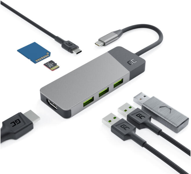 Green Cell 7 az 1-ben többportos adapter Apple MacBook M1/M2 USB-C-ről USB-C-re, HDMI, USB-A, SD, MicroSD (HUBGC01)