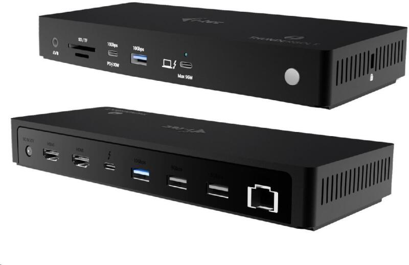 i-tec Thunderbolt4 3x Display dokkolóállomás, Power Delivery 96WLeírásA nagy teljesítményű i-tec Thunderbolt4 dokkolóállomás kompatibilis a Thunderbolt 3/4/5, USB4 és USB-C laptopokkal és táblagépekkel. Akár három külső monitor csatlakoztatására is lehetőséget nyújt. Fő jellemzőkAdatátvitel akár 40 Gbps sebességigVideokimenet akár 8K/60 Hz felbontással is5x USB port több eszköz csatlakoztatásához96W Power Delivery a kompatibilis eszközök töltéséhez2.5GLAN Ethernet a gyors internetkapcsolathozSD/TF csatlakozóhelyek memóriakártyák csatlakoztatásához3,5 mm-es audio bemenet/kimenet fejhallgató vagy hangszórók csatlakoztatásáhozMűszaki adatokA termékcsomag 1x 100 cm-es hitelesített Thunderbolt 4 kábelt tartalmaz. A dokkoló akár 96 W Power Delivery teljesítményt biztosít a kompatibilis USB4, USB-C és Thunderbolt laptopok és táblagépek számára. Akár 3 külső monitor támogatásaAkár 3 külső monitor támogatása akár 1x 8K/60 vagy 2x 4K/120Hz és 1x 4K/60Hz felbontással. Videoportok: 2x HDMI, 1x Thunderbolt 4. Portok és csatlakozók1x USB-C (10 Gbps) Power Delivery 30W-os tápellátással2x USB-A (10 Gbps)2x USB-A (5 Gbps)LAN port akár 2,5 Gbps sebességgel (10/100/1000/2500 Mbit)3,5 mm-es audio/mikrofon port1x SD/microSD foglalatLaptop teljesítmény akár 96W-igDokkolóállomás be/ki gombA csomag tartalmaThuderbolt4Thuderbolt 4 100cm kábelKéziTápegység (20V/8A 160W)
