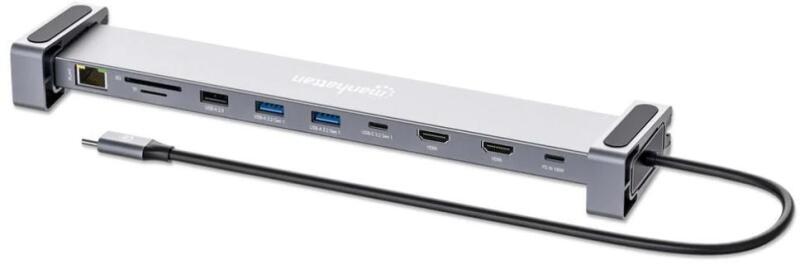 Manhattan dokkolóállomás USB-C 10v1, 2xHDMI, 2xUSB-C, 3xUSB, 1xRJ45, SD kártyaolvasó, szürke (190398)