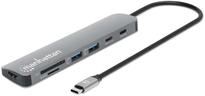Manhattan USB-C 7in1 dokkolóállomás, 1xHDMI, 2xUSB-C, 2xUSB, 2xUSB, SD kártyaolvasó, szürke színben (190442)