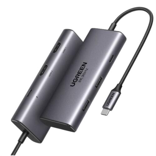 UGREEN Dokkoló állomás 6 az 1-ben, 8K@30Hz, Dual Monitor, USB HUB, Dual HDMI 2.0 és 2.1, 2x USB-A, USB-C, 100W, szürke (15852)